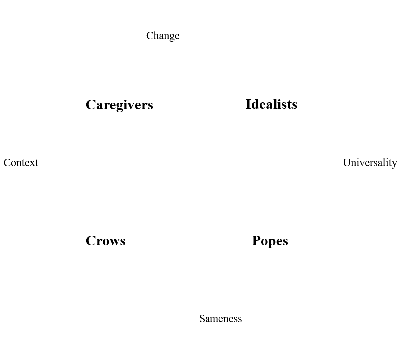 There are conceptual forces that are pushing and pulling constantly, forces that take on moral weight in their battles against each other. One person’s good change is another person’s evil sameness. One universal notion explodes into specificities that cannot be translated under a different lens. For one corporate chief, their domain is a libertarian paradise. For a middle management apparatchik in the same domain, life is lived in a communist dictatorship that accepts no dissent. The lovers of universal sameness cannot abide changes because their situation seems perfect and their perfect situation seems to represent the perfection of the whole world (see the above corporate winner). These victorious champions of conservation and the paradise that has arrived are Popes. To believe in the specificity of experience and don’t mind if things stay the same is a strange group; a set of mystic, not quite Buddhist followers of Zhuangzi, these seers of difference can’t see anything as better than anything else. We’ll call these adaptive non-interferers Crows (bring on the city, they eat trash as readily as nuts). Next we have the two lovers of change: Idealists and Caregivers.